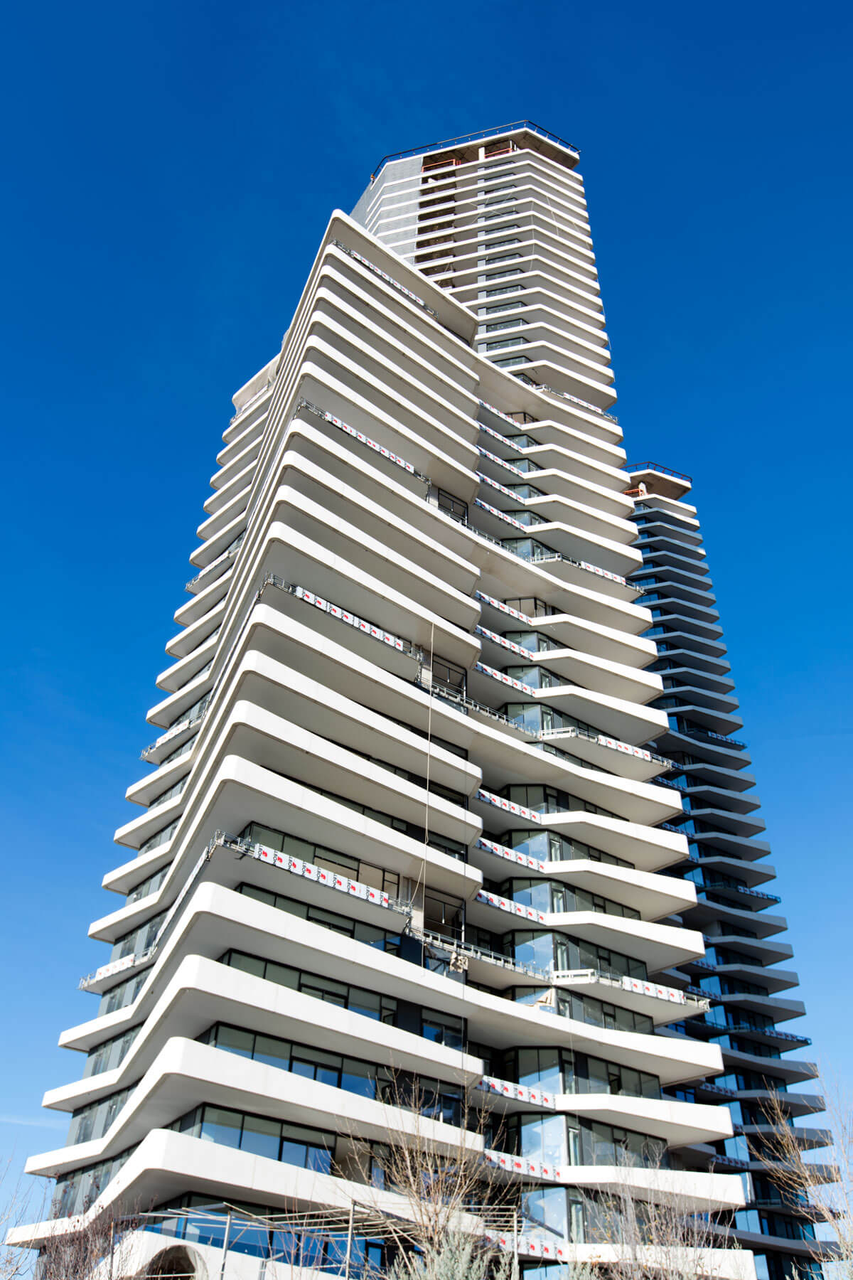 To break the intense silhouette effect created by high-rise buildings, we pulled the mass back over 23 floors and smashed the structure.